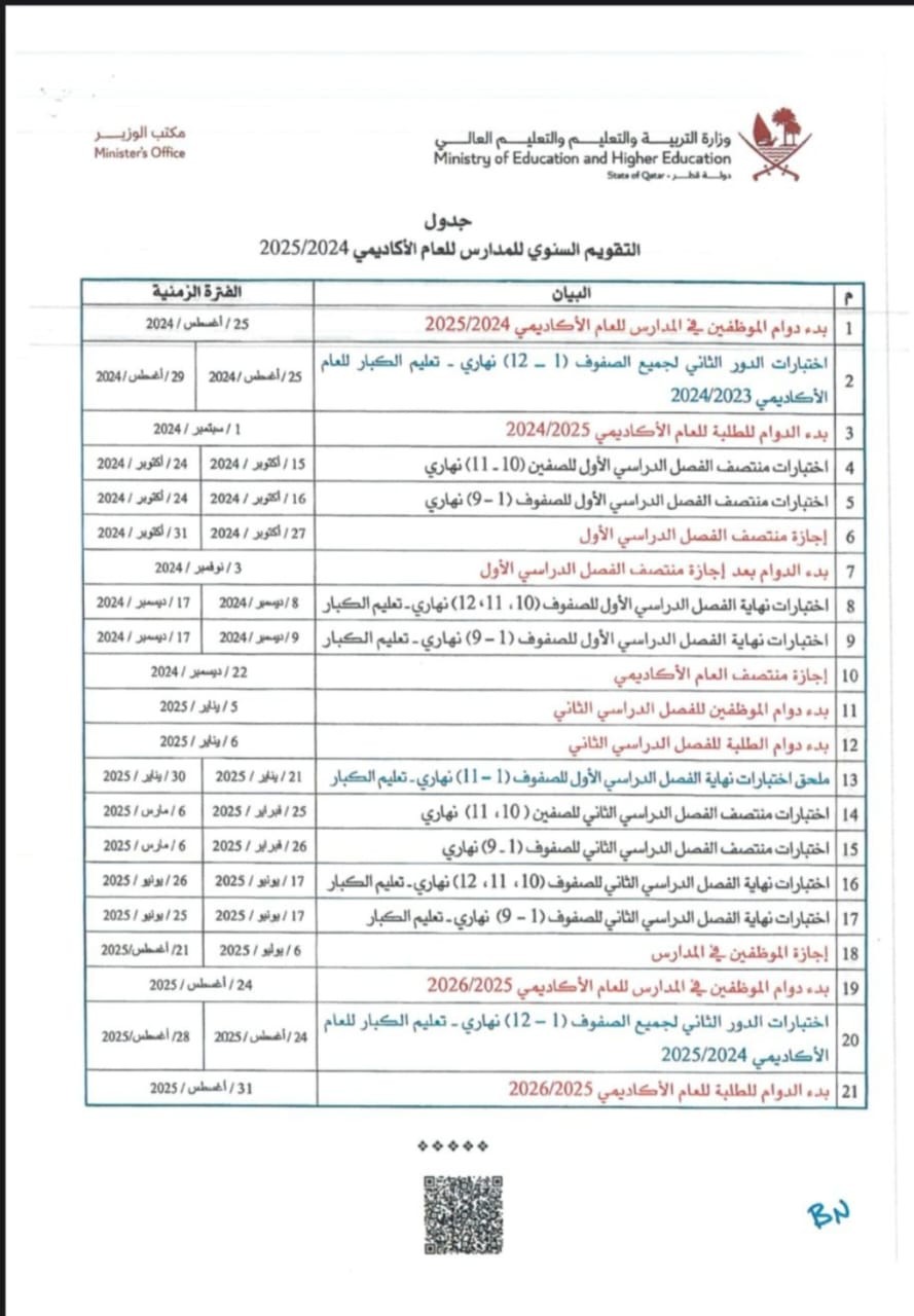 مع استكمال الاختبارات والتقييمات التي تهدف إلى تحقيق أعلى مستويات النجاح الأكاديمي.مع استمرار العام الدراسي، تبقى المدارس في قطر ملتزمة بتقديم تعليم يواكب المعايير العالمية، مع التركيز على بناء جيل قادر على مواجهة تحديات المستقبل. تستمر الرحلة التعليمية في الفصل الدراسي الثاني والذي يبدأ في 6 يناير 2025، .مع استكمال الاختبارات والتقييمات التي تهدف إلى تحقيق أعلى مستويات النجاح الأكاديمي.